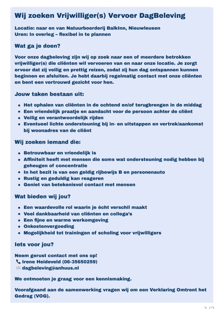 Scan me or visit www.volunteer.deedmob.com/o/AnHuus/opportunities/Wij-zoeken-een-chauffeur-voor-het-brengen-en-halen-van-deelnemers-DagBeleving/107574 to join