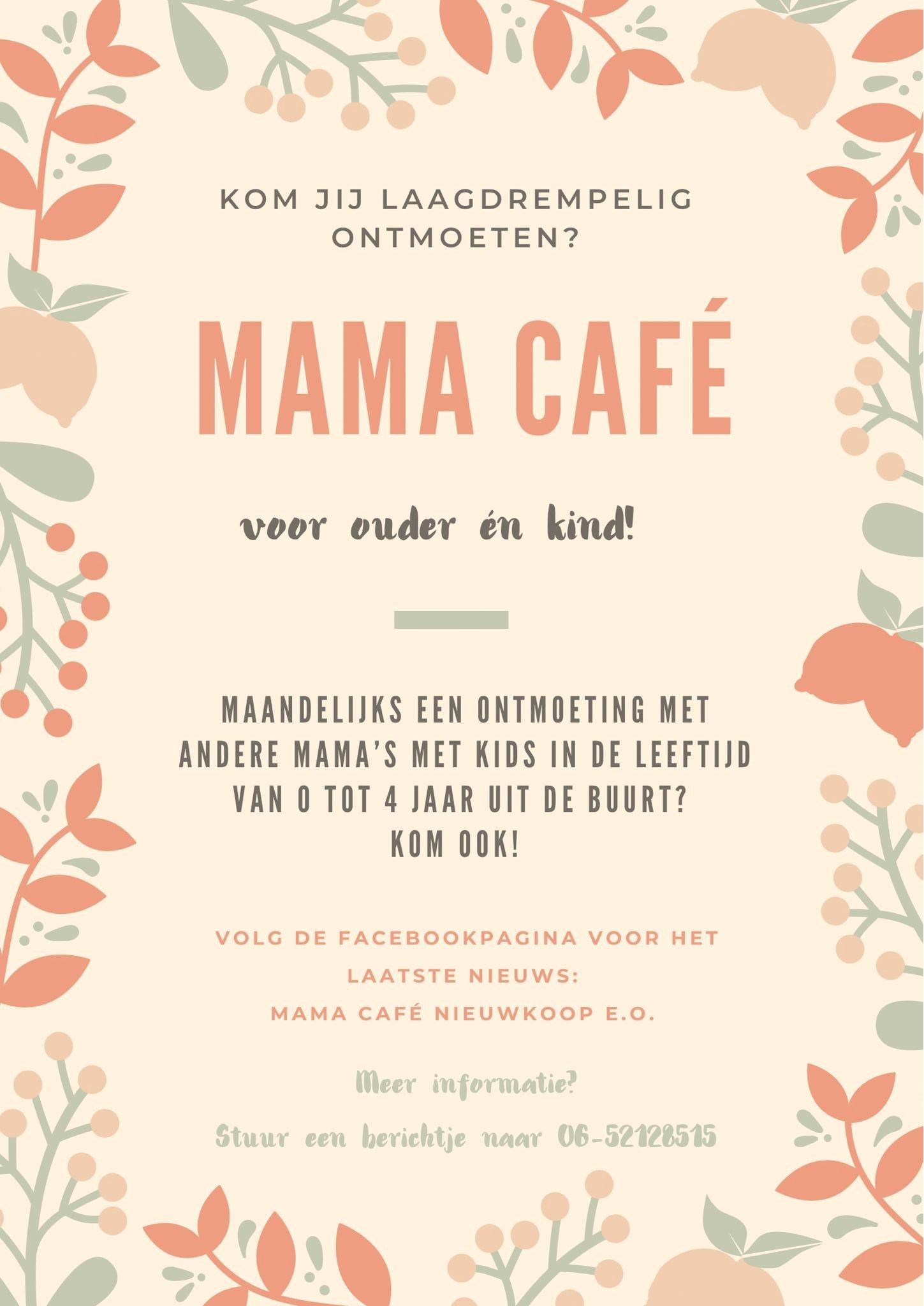 Ben je nog onbekend in de buurt? Of vind je het gewoon gezellig om andere mama’s die in dezelfde levensfase zitten te ontmoeten? Kom dan naar het Mama Café. Het Mama Café is gericht op mama's met kindjes tussen de 0 en 4 jaar uit de gemeente Nieuwkoop en omgeving. Laagdrempelig en gezellig ontmoeten staat centraal.